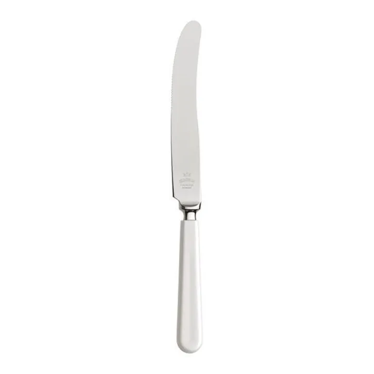 Kniv 21 cm hvit. Skaugum bestikk med hvitt skaft er en klassiker! Skaugum Bestikks kronelogo er deres garanti for at du holder et håndlaget, norsk kvalitetsbestikk. Bordknivene er smidde, som gir en skarphet og kvalitet som ingen andre produksjonsmetoder klarer. I tillegg til kniv, skje og gaffel har vi et bredt utvalg av andre deler, som for eksempel kakespade, salatbestikk og ostehøvel. Bestikket er produsert i rustfritt stål med 18/8-kvalitet. Skaugum Bestikk kan vaskes i maskin. Vi anbefaler at du alltid skyller bestikket før du setter det i maskinen, bruk gjerne finvaskprogram. Skaugum sine bestikk har sett like ut helt siden starten i 1943. Skaugum lager sine bestikk for hånd, som er en spennende og tidkrevende prosess. Stålet varmes opp til 1035 grader før vi slår med en hydraulisk hammer ned i ønsket form. Våre plastskaft blir støpt mens treskaftene sages og freses. Vi skjefter, polerer, og borer hver del for hånd på maskiner fra en annen tidsalder.