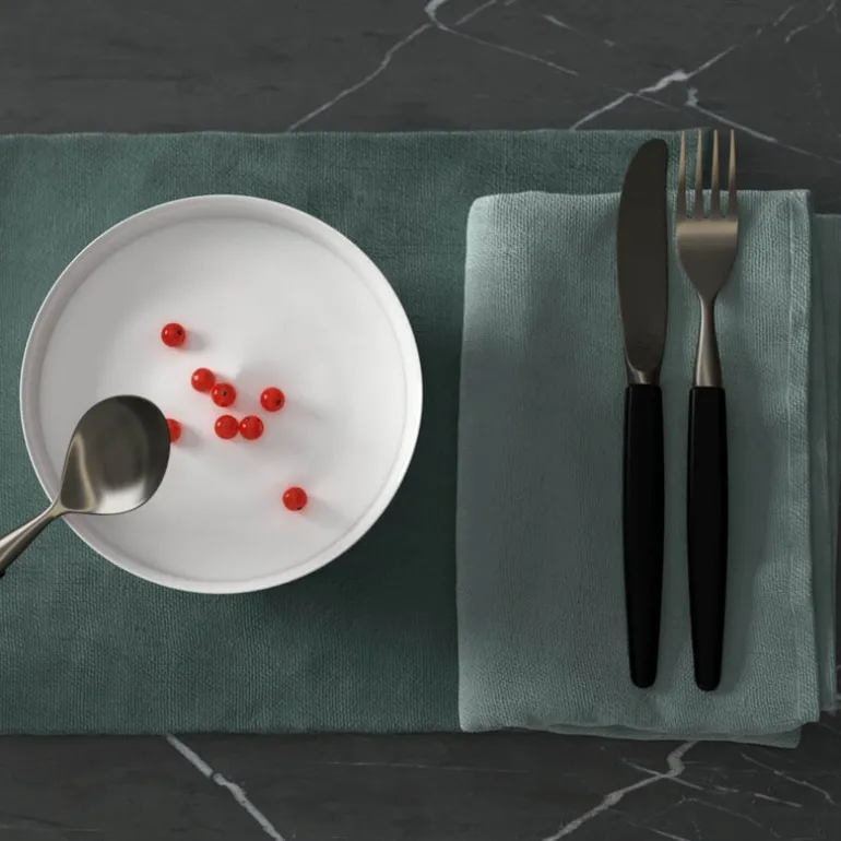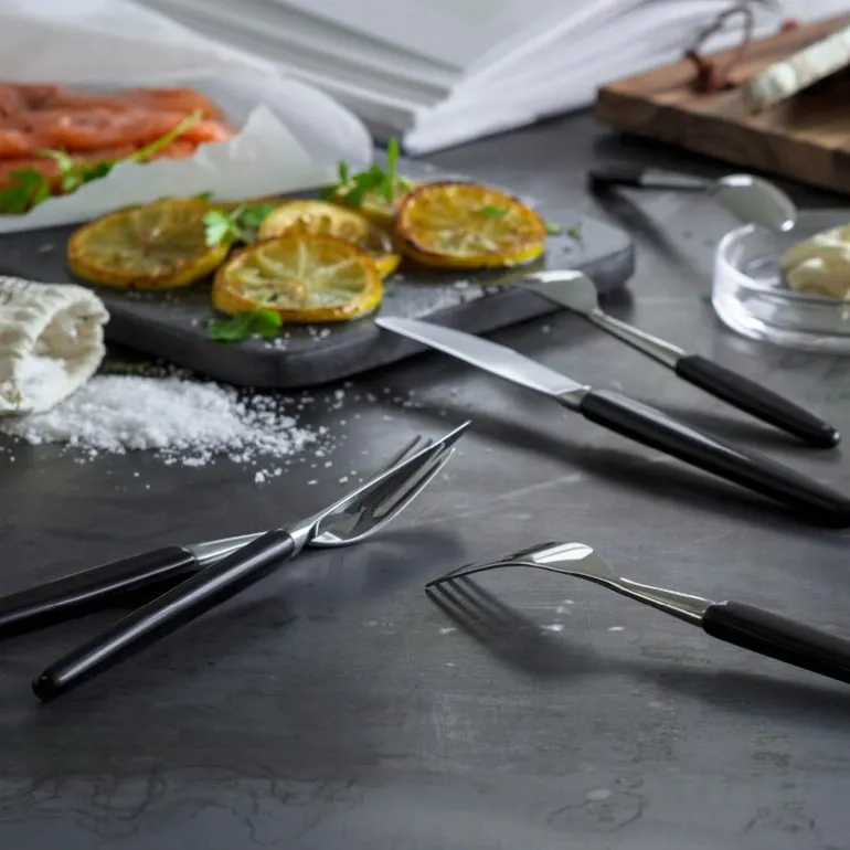 Kniv 21 cm svart . Skaugum bestikk med sort skaft er en klassiker! Skaugum Bestikks kronelogo er deres garanti for at du holder et håndlaget, norsk kvalitetsbestikk. Bordknivene er smidde, som gir en skarphet og kvalitet som ingen andre produksjonsmetoder klarer. I tillegg til kniv, skje og gaffel har vi et bredt utvalg av andre deler, som for eksempel kakespade, salatbestikk og ostehøvel. Bestikket er produsert i rustfritt stål med 18/8-kvalitet. Skaugum Bestikk kan vaskes i maskin. Vi anbefaler at du alltid skyller bestikket før du setter det i maskinen, bruk gjerne finvaskprogram. Skaugum sine bestikk har sett like ut helt siden starten i 1943. Skaugum lager sine bestikk for hånd, som er en spennende og tidkrevende prosess. Stålet varmes opp til 1035 grader før vi slår med en hydraulisk hammer ned i ønsket form. Våre plastskaft blir støpt mens treskaftene sages og freses. Vi skjefter, polerer, og borer hver del for hånd på maskiner fra en annen tidsalder.