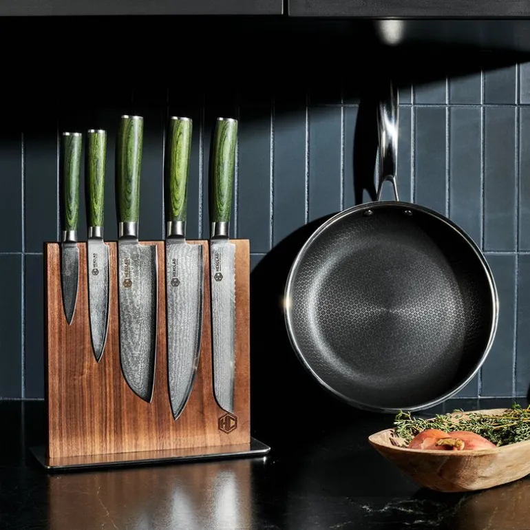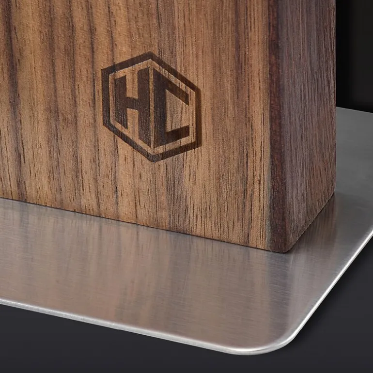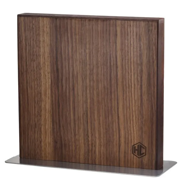 Hexclads magnetiske knivblokk i valnøtt, 23 cm. Denne tosidige blokken er designet med naturlig, glattkornet valnøtt som gir kjøkkenet ditt et elegant uttrykk, samtidig som den beskytter knivene dine på best mulig måte. Innebygde industrielle magneter holder knivene sikkert på plass, slik at de er lett tilgjengelige og alltid klare til bruk.