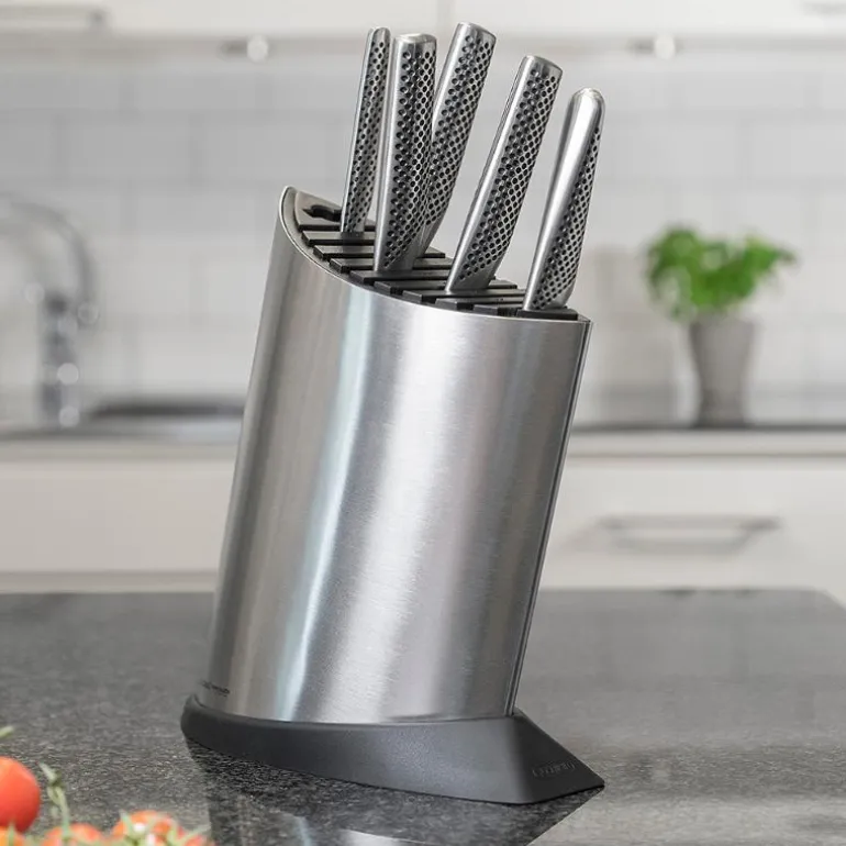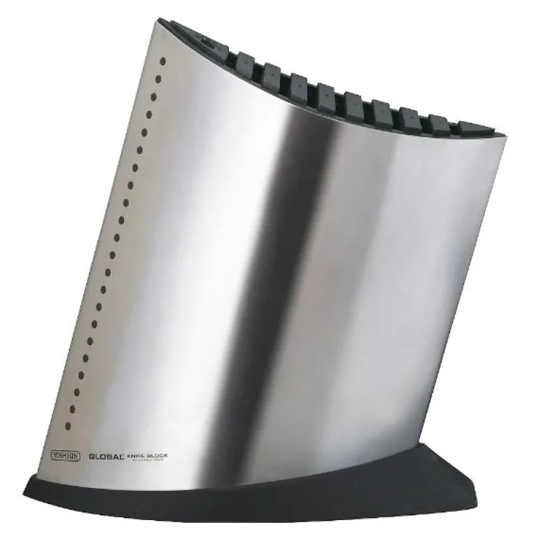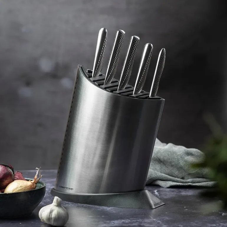 Ikke la kjøkkenknivene ligge i bestikkskuffen. I Globals knivblokk kan du oppbevare knivene trygt. Denne modellen har 9 kniver og et skjerpestål. Blokken passer for kniver med bladlengde på opptil 28 cm. Høyde: 32 cm.