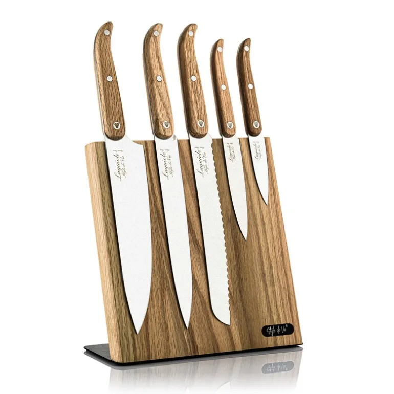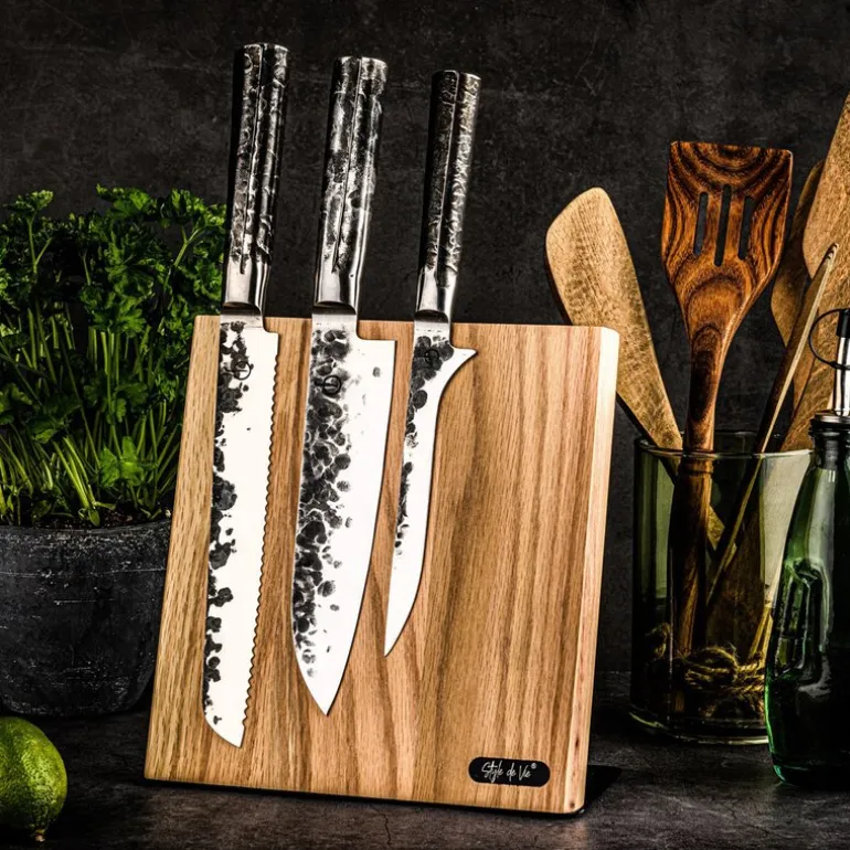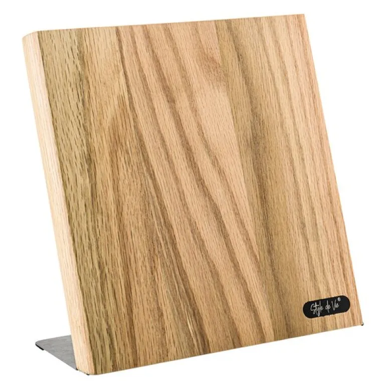Style de Vie magnetisk knivblokk i eik kombinerer naturlig materiale med funksjonell design. Hver blokk er laget av ekte eiketre, noe som gjør at ingen er helt like – både farge og trestruktur varierer. Med plass til 5–7 kniver dekker den behovet for trygg og oversiktlig oppbevaring.