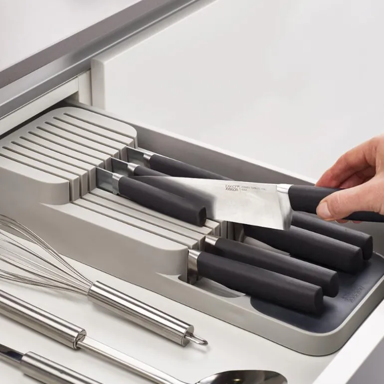 Knivoppbevaringen fra Joseph Joseph tilbyr en klar organisering og trygg lagring av kjøkkenknivene dine. Å la kniver ligge løst i skuffen kan være farlig og føre til sløvhet på bladene, samt øke risikoen for skade på knivene. Med denne knivinnsatsen på to etasjer får du en perfekt løsning for enkel og sikker oppbevaring av knivene dine, samtidig som du har rask tilgang til dem. Innsatsen har plass til kniver med forskjellige lengder (maks. 26 cm) og kan holde opptil ni kniver.