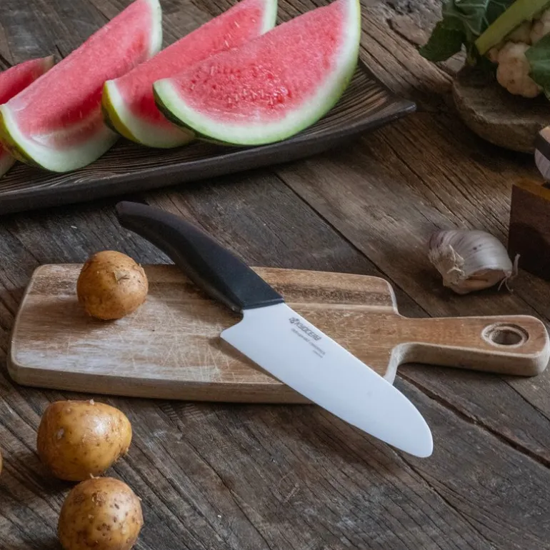 En av de skarpeste knivene du kan bruke, med keramiske blader – verdens hardeste materiale etter diamant. Det betyr at du kan konsentrere deg om maten og ikke om knivvedlikehold. Kniven ruster ikke og er ikke påvirket av syrer. I tillegg kan den vaskes i maskin. Bare husk å ikke bruke kokkekniver til frosne råvarer, harde bein eller skalldyr.