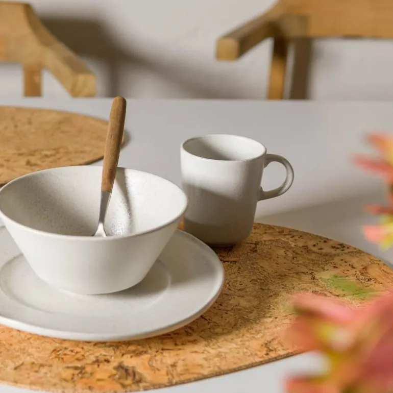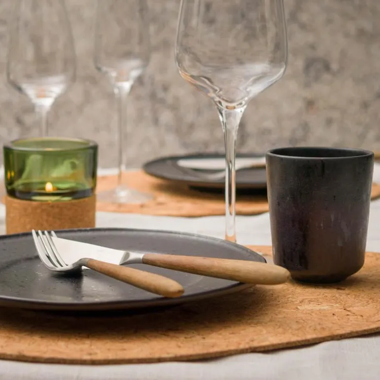 Høsting av verdens mest bærekraftige kork i Portugal! Korken på spisebrikkene kommer fra utvalgte korkeiketrær i Portugal, og ettersom kork er et naturlig materiale, har hver spisebrikke dermed et unikt uttrykk og mønster. Korken høstes hvert 10.år i mai-september for hånd, når det er tørt. Treet må også være 60-100 år før man kan høste god kvalitet. Det er også et fantastisk materiale fra et miljøperspektiv da det senker nivåene av karbondioksid i luften gjennom vekstprosessen. Når korken blir høstet fra treet, tar det omtrent 9 år før den er helt regenerert. I løpet av denne perioden absorberer treet 3-5 ganger mer karbondioksid enn et tre der korken ikke er blitt høstet.