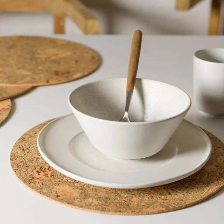 Høsting av verdens mest bærekraftige kork i Portugal! Korken på spisebrikkene kommer fra utvalgte korkeiketrær i Portugal, og ettersom kork er et naturlig materiale, har hver spisebrikke dermed et unikt uttrykk og mønster. Korken høstes hvert 10.år i mai-september for hånd, når det er tørt. Treet må også være 60-100 år før man kan høste god kvalitet. Det er også et fantastisk materiale fra et miljøperspektiv da det senker nivåene av karbondioksid i luften gjennom vekstprosessen. Når korken blir høstet fra treet, tar det omtrent 9 år før den er helt regenerert. I løpet av denne perioden absorberer treet 3-5 ganger mer karbondioksid enn et tre der korken ikke er blitt høstet.