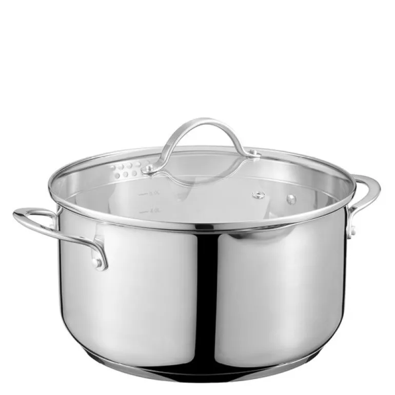 Den trelags konstruksjonen med aluminiumskjerne sørger for jevn varmefordeling, mens yttersjiktet i rustfritt stål gir solid holdbarhet. Glasslokket gjør det enkelt å følge med på matlagingen uten å slippe ut varme og fuktighet. Ergonomiske håndtak gir et godt og sikkert grep – også når gryten er full.