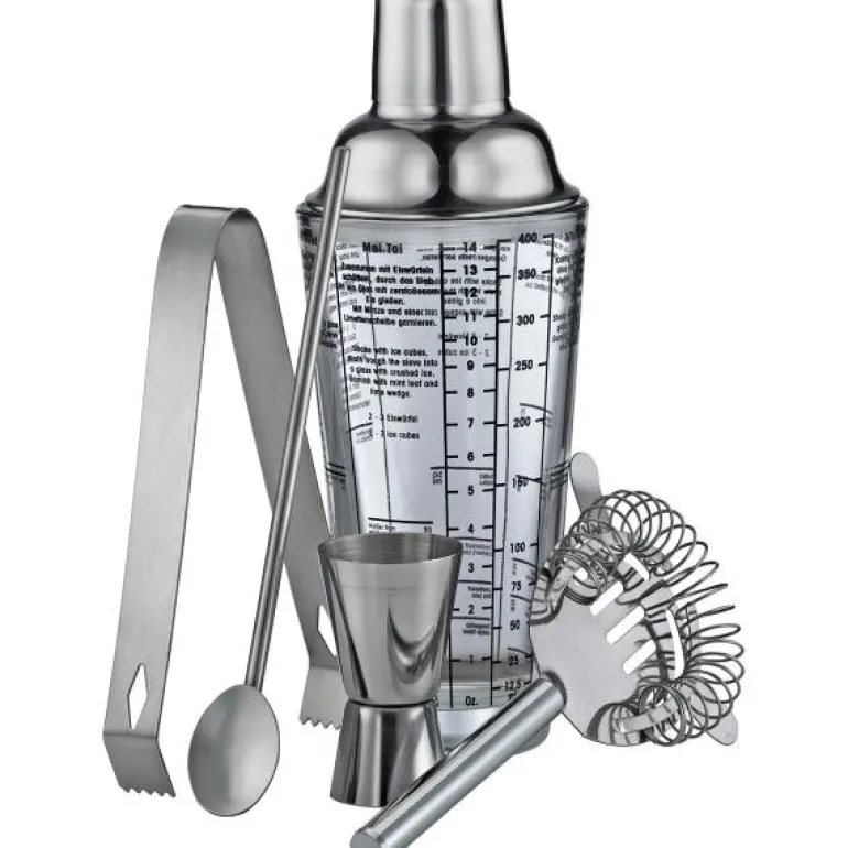 Med dette 5-delte barsettet kan du lage cocktailer og drinker som en profesjonell. Cocktailshaker, målebeger, sil, isbar og cocktailskje er alle laget av rustfritt stål. koppen og toppen av shakeren passer perfekt sammen slik at ingenting lekker. målebegeret kan ha 2cl på den ene siden og 3cl på den andre, slik at du raskt og enkelt kan måle nøyaktig mengde opp til drikken din. Silen forhindrer at alt annet enn væsken kommer inn i glasset ditt. Isbaren har godt grep om isbitene, slik at de kan transporteres hygienisk til drikken. Skjeen er ekstra lang og tynn slik at den kan komme ned blant isbitene i høye glass.