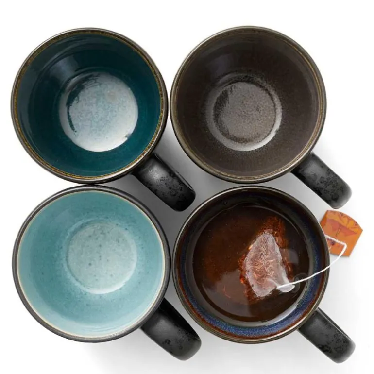 Fire fine BITZ-krus med hank i matt svart steintøy med elegant, blank glasur på innsiden. Mørk blå, grønn, lys blå og grå.