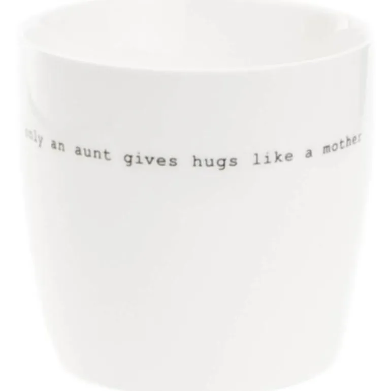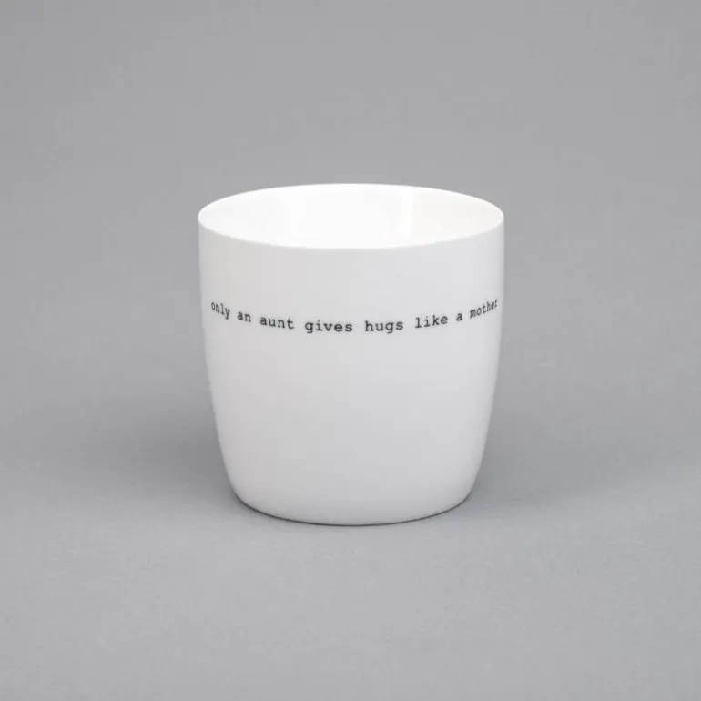 Hvitt krus fra Sögne Home, med teksten only an aunt gives hugs like a mother i svart. Det håndlagde sögne kruset så dagens lys i 2013, og har med sitt tynne porselen og gode hank, blitt manges favoritt! Kolleksjonen av krus kommer i ulike farger, størrelser og utvalgte populære tekster. Sögne sine krus er blitt folkekjære favoritter som de er stolte av! Krusene er med sitt tidløse design laget for å vare i generasjoner og fylle din dag med et treffende hverdags budskap. Krusene er hyggelig å bruke der du er med familie, venner, kollegaer og som gave for ulike anledninger. Krus med varme verdier.