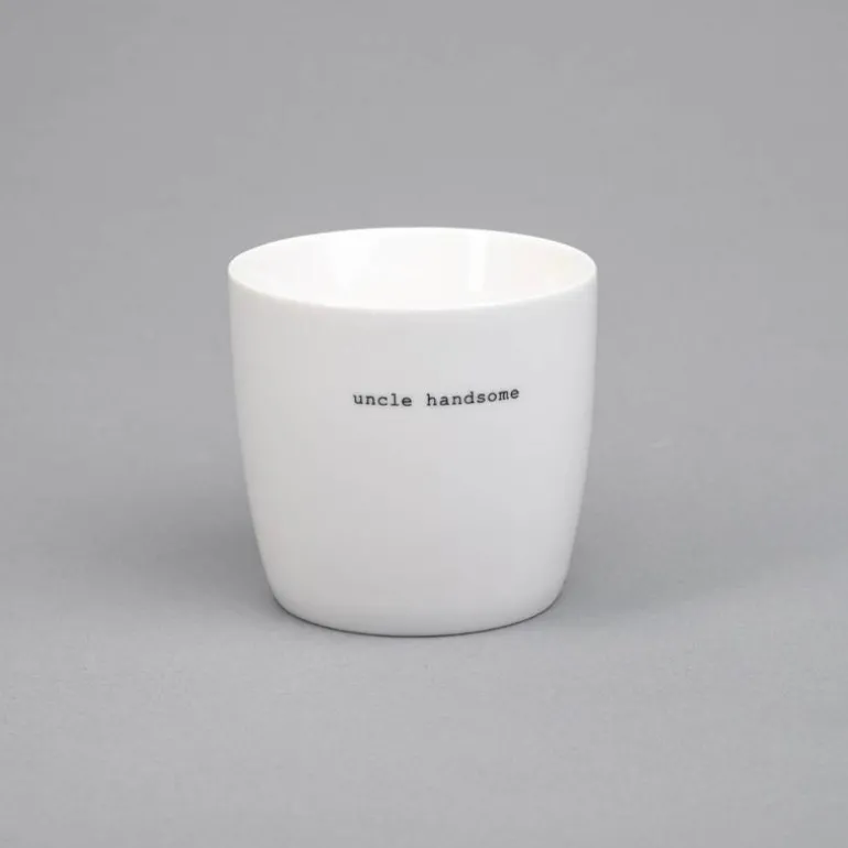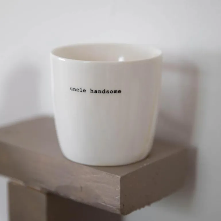 Hvitt krus fra Sögne Home, med teksten uncle handsome i svart. Det håndlagde sögne kruset så dagens lys i 2013, og har med sitt tynne porselen og gode hank, blitt manges favoritt! Kolleksjonen av krus kommer i ulike farger, størrelser og utvalgte populære tekster. Sögne sine krus er blitt folkekjære favoritter som de er stolte av! Krusene er med sitt tidløse design laget for å vare i generasjoner og fylle din dag med et treffende hverdags budskap. Krusene er hyggelig å bruke der du er med familie, venner, kollegaer og som gave for ulike anledninger. Krus med varme verdier.