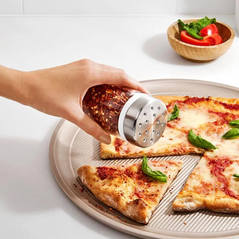 Krydder- og sukkerstrøer fra OXO har to innstillinger; små hull til fint krydder og melis og store hull til grovt krydder eller sukker. Den kan også lukke helt tett ved oppbevaring. Beholderen er fremstilt i borosilikatglass, og både den og lokket tåler oppvaskmaskin.