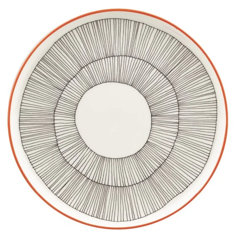 Kukat Puhkeavat asjett fra Marimekko er laget av porselen og måler 20 cm i diameter. Tallerkenen kombinerer det livlige Kukat Puhkeavat-mønsteret med en håndmalt oransje kant, og gir et fargerikt og personlig preg til måltidet. Den er en del av den populære Oiva-serien, kjent for funksjonalitet og design i balanse.
