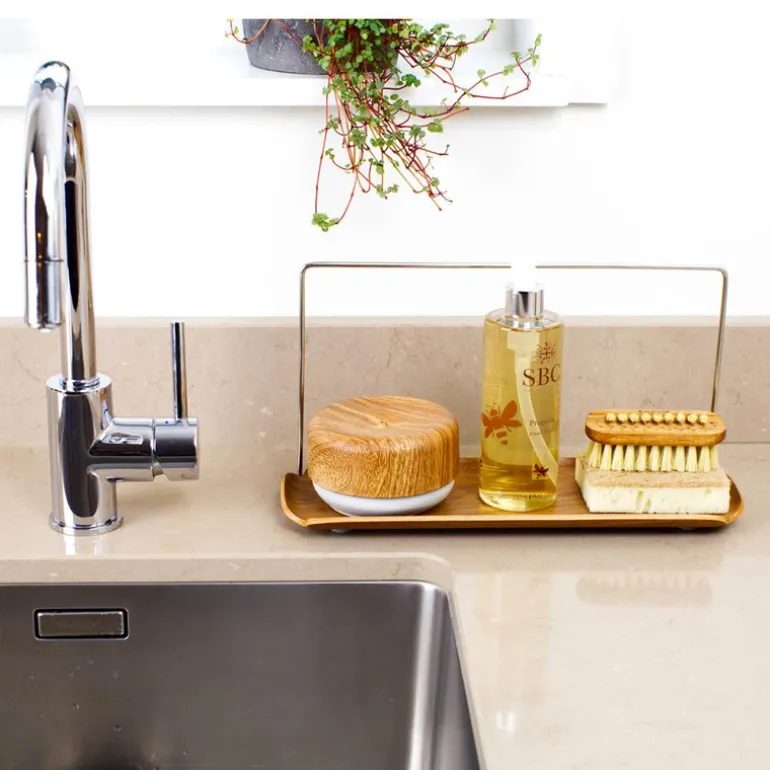 Det medfølgende stativet i rustfritt stål gir en praktisk løsning for lufttørking av oppvaskkluten, samtidig som de høye kantene på brettet sørger for at gjenstander holder seg på plass. De stabile gummiføttene forhindrer at brettet sklir, selv på våte flater. Når det trenger rengjøring, er det enkelt å tørke av med en fuktig klut.