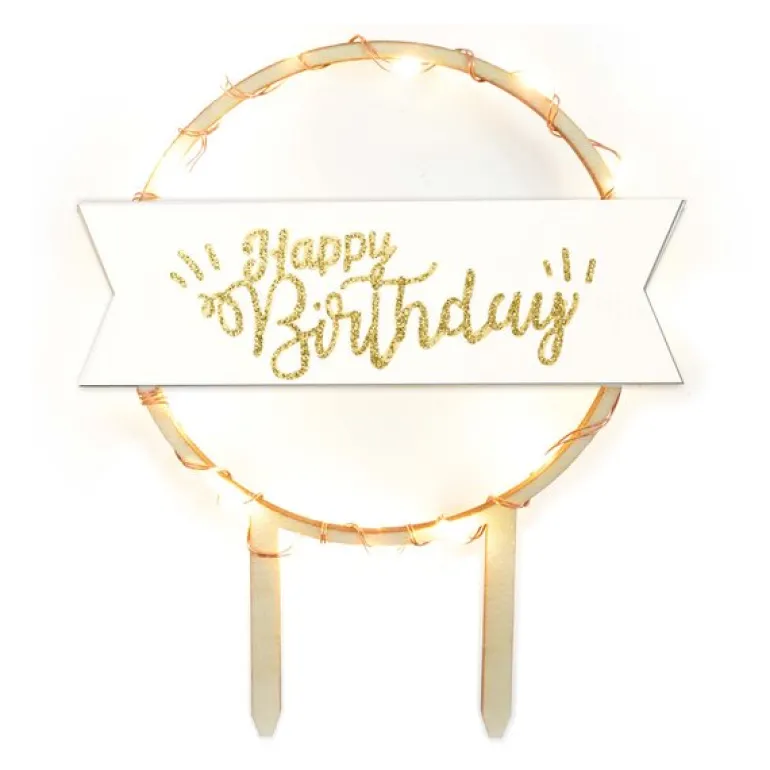 Skap en glitrende bursdagsstemning med LED kaketopp fra ScrapCooking! Den naturfargede «Happy Birthday»-toppen har integrerte LED-lys og kommer med tre ulike lysmoduser: fast lys, rolig glød eller blinkende effekt. En enkel måte å løfte kakepynten til nye høyder!