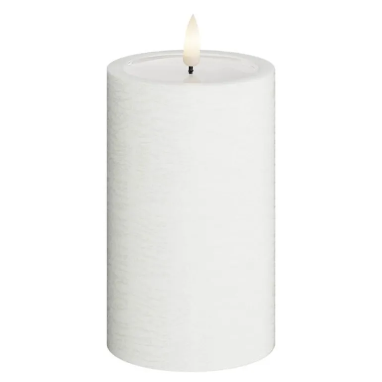 LED Kubbelys 7,5 x 12,5 cm i hvit fra UNIQUE, kombinerer eleganse og trygghet. Den strukturert overflaten og unike wetlook-toppen gir lyset et håndlaget og autentisk uttrykk som minner om smeltet stearin.