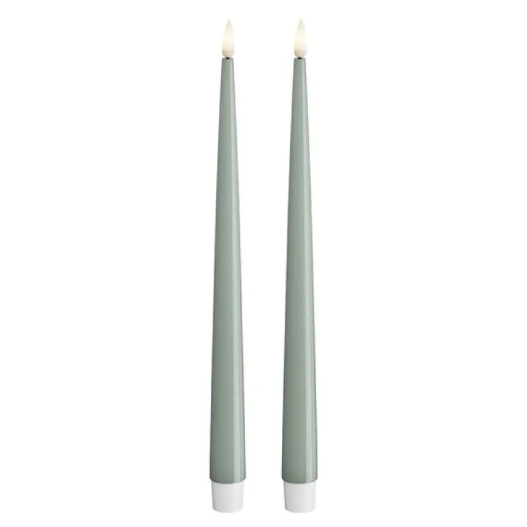 LED lakklys 2,2 x 28 cm i salviegrønn fra Deluxe Homeart gir et eksklusivt uttrykk til både hverdag og fest. Den elegante lakkerte overflaten og den naturtro 3D-flammen gir lysene et luksuriøst preg – helt uten risiko for brann eller røyk.