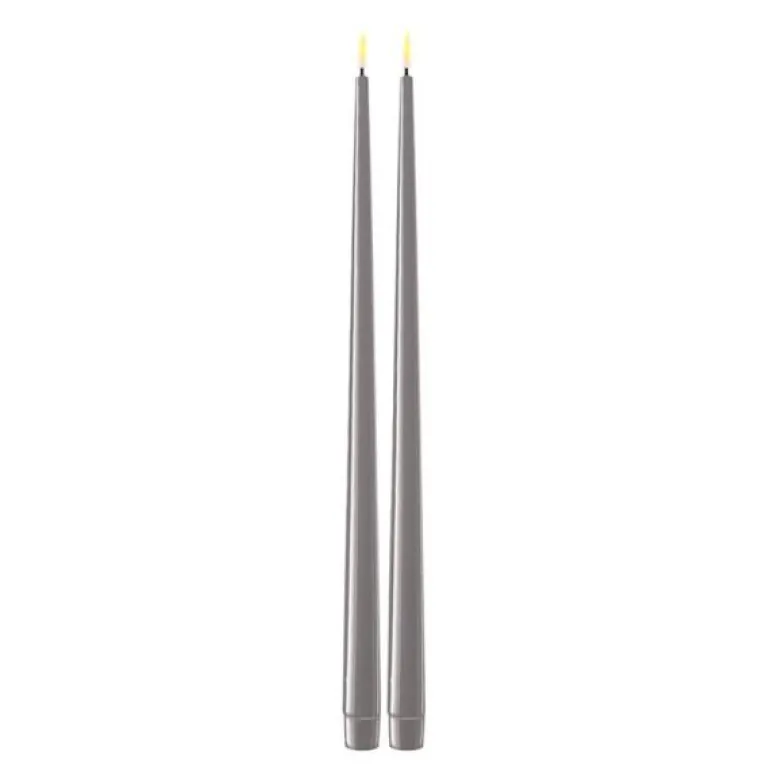 LED shiny dinner candle fra Deluxe Homeart, kommer i en pakke med 2 stk 38 cm høye lys i fargen grå. Deluxe Homeart har designet Real Flame – noe som gir en naturtro 3D-flamme. Shiny dinner candles er laget av 100% ekte stearin – veldig vakre og naturtro. Tenk på inneklima, miljø og brannfare! Om du vil unngå giftige partikler og sot fra vanlige stearin lys, så er disse LED-lysene et flott alternativ.