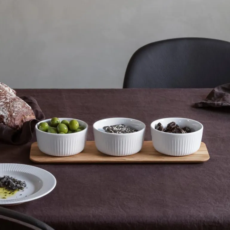 Legio Nova snacksett fra Eva Trio består av to elegante porselensboller og et stilrent fat i ubehandlet eik. Bollene har den karakteristiske rillestrukturen som kjennetegner Legio Nova-serien, og de passer perfekt til alt fra nøtter og oliven til ferske bær, grønnsaker eller ulike dipper.