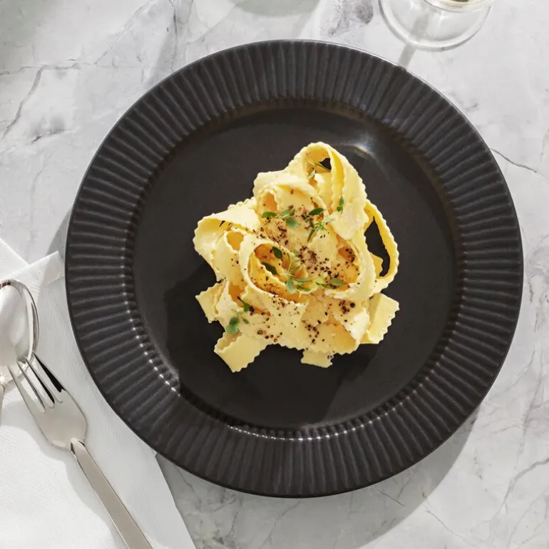 Med Legio Nova middagstallerken 25 cm fra Eva Trio får du en tidløs og stilren tallerken som passer til enhver anledning. Den matte, svarte overflaten og den diskrete rilledekoren gir en elegant ramme rundt maten og skaper en sofistikert atmosfære ved bordet.