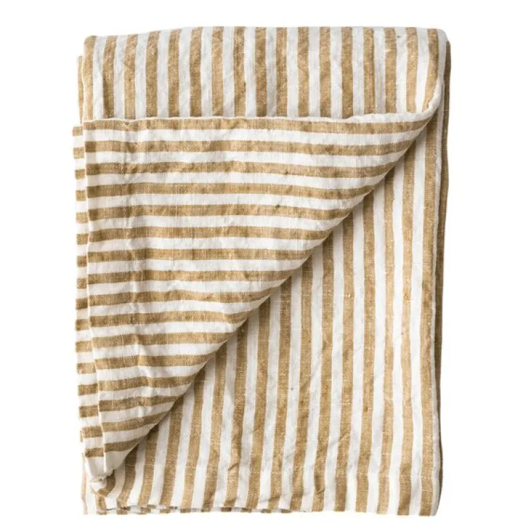 Leon duk fra Tell Me More i størrelse 145×270 cm er håndvevd i 100 % europeisk lin og har et klassisk stripet mønster i nyansen seagrass. Den dekorative vevkanten og den grove linstrukturen gir duken et tydelig håndverksmessig uttrykk.