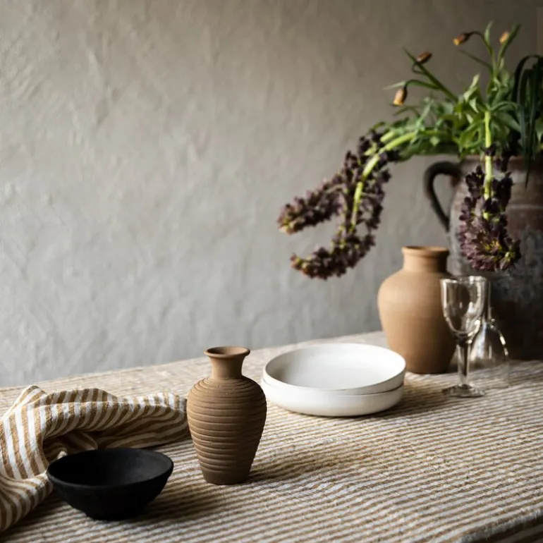 Garnet er farget for hånd og tørket i solen, noe som gir stoffet naturlige og levende fargevariasjoner. Den varme tonen og det tidløse designet gjør duken like egnet til festlige anledninger som til hverdagsbruk.