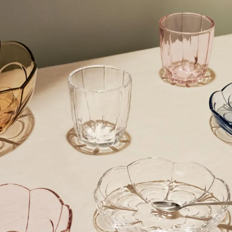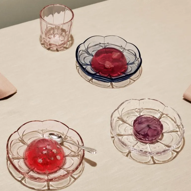 Desserttallerkenene er enkle å stable og kan vaskes i oppvaskmaskin, så du kan bruke dem daglig uten å måtte bekymre deg for å vaske dem for hånd. Serien inneholder også en stor serveringsskål, en mindre skål og vannglass – alle i fire forskjellige farger. Alle delene i Lily-serien er laget av farget glass, slik at fargen holder seg vakker over tid.