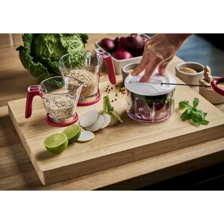 Easy Pull fra Zyliss er en manuell foodprosessor i et patentert design, som gjør det mulig å hakke, blande og purere mat ved å ganske enkelt trekke i håndtaket. Trekk 3-5 ganger for grovhakket og 8-10 ganger for finhakket. Produktet vil gjøre din hverdag mye enklere, samt opplevelsen på kjøkkenet mye morsommere uten bruk av elektroniskt utstyr.