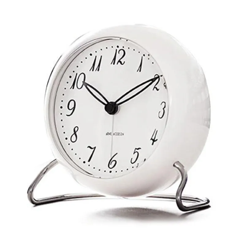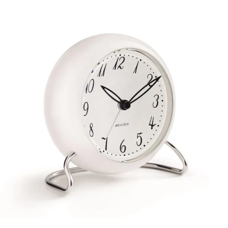 Etter mange år i glemmeboken vender Arne Jacobsens bordklokke nå sterkt tilbake til moderne innredning. Takket være oppdaterte funksjoner som snooze og lyssensorer er bordklokken funksjonelt egnet både som klokke og vekkerklokke, men de fleste vil antagelig ta til seg den nye table clock som et designobjekt. Med sin grafiske sort/hvite fargeskala og elegante metall fot, med umiskjennelig inspirasjon fra Mauren og Sjuer-stolen, passer bordklokken inn overalt i en moderne bolig: i soveværelset, stuen, kjøkkenet, reolen og ikke minst på kontoret, som den ultimate gadget for designelskere som passer på stilen til enhver tid.
