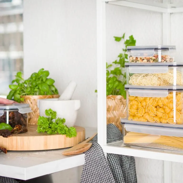 Produsert i Tritan® plast som har et glassklart utseendet. Lokk i PP plast med silikonkant for lufttett lukking som bevarer smak og ferskhet i råvarene.