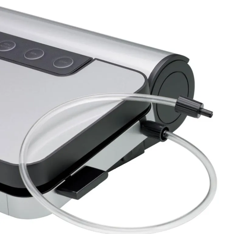 Uansett om du bare skal oppbevare matvarene dine i kjøleskapet i et par dager, tilberede maten din i en sous-vide eller om maten skal ligge en stund i fryseren, så forlenger vakuumering av matvarene dine alltid holdbarheten samtidig som de bevarer både smaken og næringsstoffene. De fem opplyste funksjonsknappene er utrolig enkle å betjene, og arbeidet blir lettere takket være de automatiske programmene til våte eller tørre matvarer. Samtidig sørger den dobbelte sveisesømmen for at det ikke renner noe inn i eller ut av pakningen. Vacuumeringmaskinen er utstyrt med 6 meter folie som passer perfekt i den praktiske og avtakbare oppbevaringsboksen, og foliestykkene skjæres i den helt rette lengden takket være den innebygde folieskjæreren. Elegant fremstilt i Cromargan®. Inkl. folie, pose og vakuumeringsslange til beholderen.