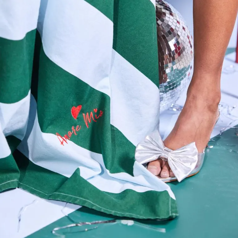 Ekspressive striper er et tilbakevendende tema for Byon. Love-duken kombinerer et klassisk mønster med en dristig fargekombinasjon i lyseblått og grønt. Med en dominerende lidenskapelig rødtone er Love brodert med et hjerte og teksten «Amore Mio» som betyr «min kjærlighet». En oppfordring fra oss om å skape litt ekstra varme og kjærlighet til alle borddekkinger. Matchet med Love eller Leya-familiene for maksimal Byon-følelse. Gjør borddekkingen mer leken og trivelig. Laget av sertifisert økologisk bomull. Mål 150×280 cm for også å klare litt lengre bord. Design Byon Studio. Kommer med vakkert Byon-bånd.