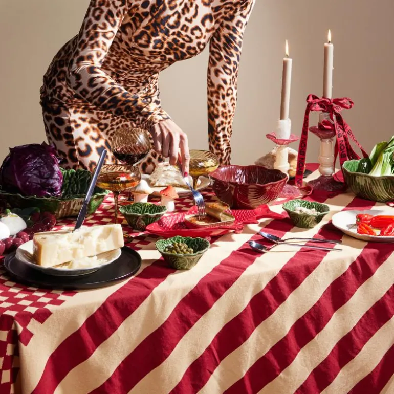 Ekspressive striper er et tilbakevendende tema for Byon. Love-duken kombinerer et klassisk mønster med en dristig fargekombinasjon av kirsebærrød og smørgul. Duken Love er brodert med et svart hjerte og teksten «Buon Appetito» som betyr «velsmakende måltid». En oppfordring fra oss om å skape litt ekstra varme og kjærlighet til alle borddekkinger. Matchet med Love eller Leya-familiene for maksimal Byon-følelse. Gjør borddekkingen mer leken og trivelig. Laget av sertifisert økologisk bomull. Mål 150×280 cm for også å klare litt lengre bord. Design Byon Studio. Kommer med vakkert Byon-bånd.
