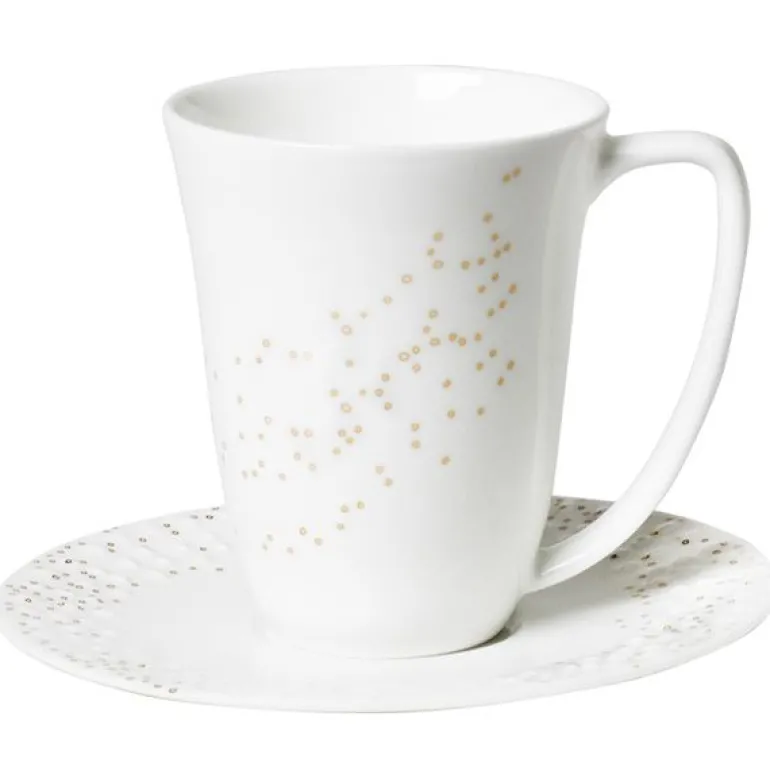 Lys kopp med skål på 20 cl fra Wik & Walsøe kombinerer eleganse og funksjonalitet i edelt benporselen av høy kvalitet. Dekorert med et delikat mønster av små snøflak og en subtil kant i 24 karat gull, utstråler koppen et glansfullt og luksuriøst uttrykk. Den smale kanten gjør koppen god å drikke av, mens den funksjonelle hanken – et kjennetegn hos Wik & Walsøe – gir et komfortabelt grep. Lys-kolleksjonen byr på en varm, ren hvitfarge og har en gjennomskinnelighet som viser benporselenets vakre kvalitet. Perfekt til både frokost og fest, kan denne koppen tilpasses alle anledninger med sin slitesterke og tidløse design.