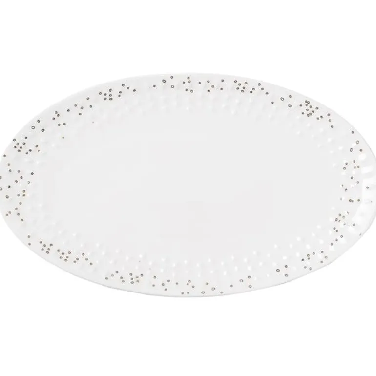 Lys oval asjett på 20 cm fra Wik & Walsøe tilfører borddekkingen en subtil eleganse og et luksuriøst uttrykk. Denne vakre asjetten er laget i edelt benporselen, kjent for sin gjennomskinnelige kvalitet og varme, hvite tone. Med en dekor av små snøflak og en kant av 24 karat gull skaper asjetten en rolig og sofistikert atmosfære. Lys-kolleksjonen passer både til hverdagens små måltider og mer festlige anledninger, og asjettens tidløse design gjør den til et naturlig innslag i enhver borddekking.