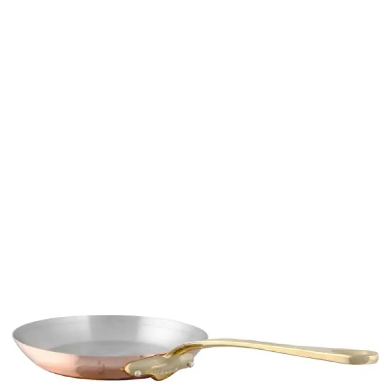M’150b stekepanne 26×4 cm kobber/messing. Mauviels eksklusive M’150b-serie har et indre belegg av rustfritt stål og flott kobber ytterst. Tykkelse: 1,5 mm – 90 % kobber, 10 % rustfritt stål. M’150b gir deg optimal kontroll over matlagingen, siden kobber har en høy yteevne som varmes opp svært jevnt og mye raskere enn andre metaller; det rustfrie stålets indre bevarer smak og næringskvaliteter i maten og er lett å rengjøre.