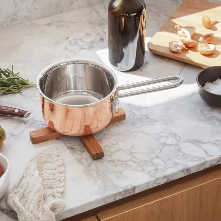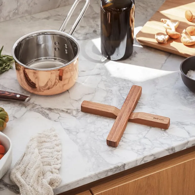 Magnetisk bordskåner 20 cm bambus fra Eva Solo. Bordskåneren kan plasseres på tvers under gryter og mindre fat og deles i to under større fat og panner. Takket være de innebygde magnetene følger bordskåneren kjelen rundt på bordet, og etter bruk tar den minimalt med plass i skuffen.