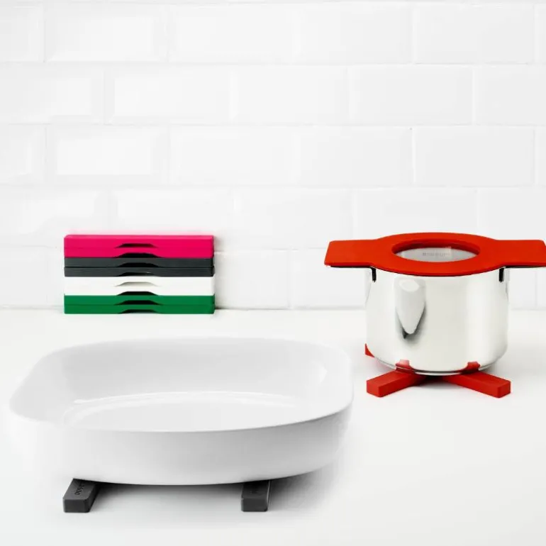 Bordskåneren kan legges i kryss under gryter og mindre fat, og deles i to under større fat og f.eks. langpanner. Takket være de innebygde magnetene sitter bordskåneren fast under gryten, og etter bruk tar den minimalt med plass i skuffen.
