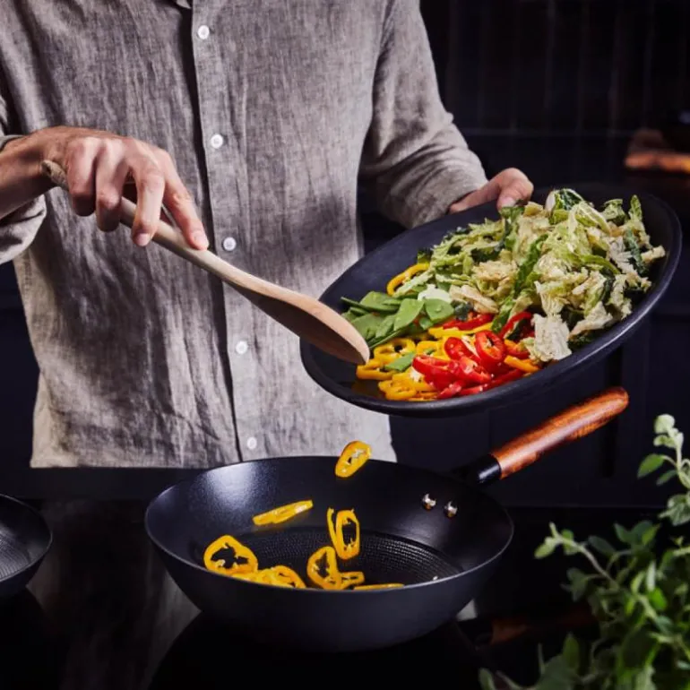 Pannen har en keramisk non-stick-overflate med et strukturert «honeycomb»-mønster som sørger for optimal fordeling av olje og fett. Resultatet blir jevnt stekte ingredienser med perfekt skorpe, uansett hva du lager. Den glatte emaljen på utsiden gjør pannen motstandsdyktig mot høye temperaturer, også på grill.