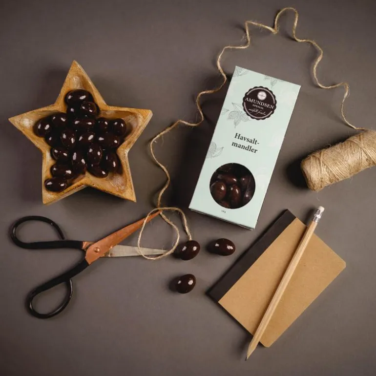 Ingredienser: Kakaomasse, sukker, MANDEL (20 %), kakaosmør, havssalt, emulgeringsmiddel (SOYALECITIN), naturlig vanilje aroma, overflatebehandlingsmiddel E904, glukosesirup, modifisert tapiokastivelse, vegetabiliske oljer (kokos, raps) i varierande proporsjon. Den mørke sjokoladen inneholder min 52 % kakao.