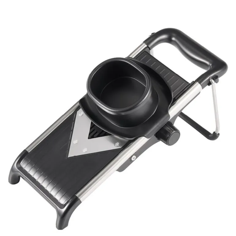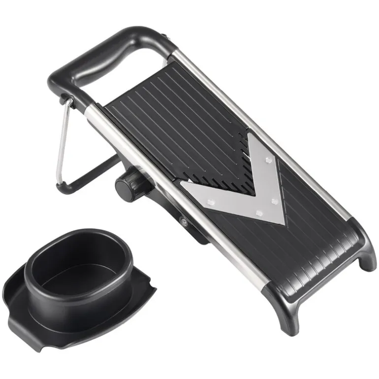 Foldbare ben gir god stabilitet på kjøkkenbenken, og gjør det enkelt å arbeide trygt og komfortabelt. Med det justerbare hjulet velger du enkelt ønsket skjærtykkelse, og bytter mellom vanlige eller julienneblader. Matvareholderen beskytter fingrene og gir trygg håndtering. Perfekt til salater, wok og gryteretter.