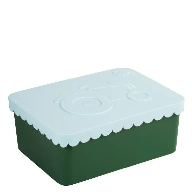 Matboks i plast med ett rom fra Blafre. Matboksen er lys blå med traktormotiv.