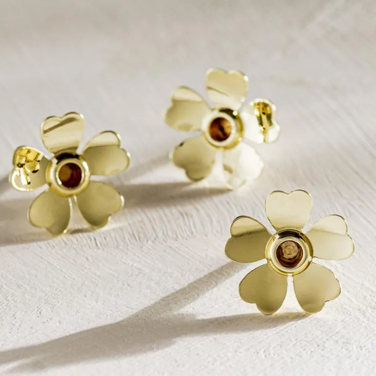 Tre stykk gullfargede, blomsterformede lysestaker til kakelys, Me To You, fra Design House Stockholm. Søren Niedziella har formet lysestakene av ekte evigvarende materialer i stedet for kasteplast. Me To You blir igjen etter at lysene er blåst ut og festkaken er ferdig.