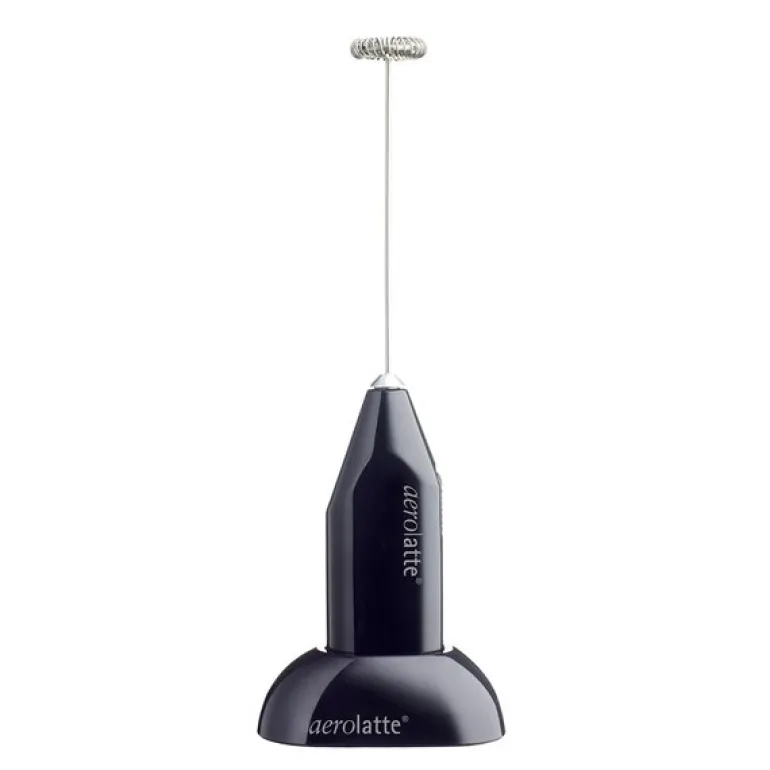 Den svarte melkeskummeren fra Aerolatte er et praktisk verktøy for å lage silkemykt melkeskum på bare 20 sekunder. Skummerens originale vispehode passer perfekt til både animalsk og vegetabilsk melk, og den slitesterke akselen og motoren gir pålitelig ytelse over tid. Medfølgende holder fungerer som et pent stativ, noe som gir et stilrent preg på kjøkkenet. Batterier inkludert, så du kan skumme melk umiddelbart.