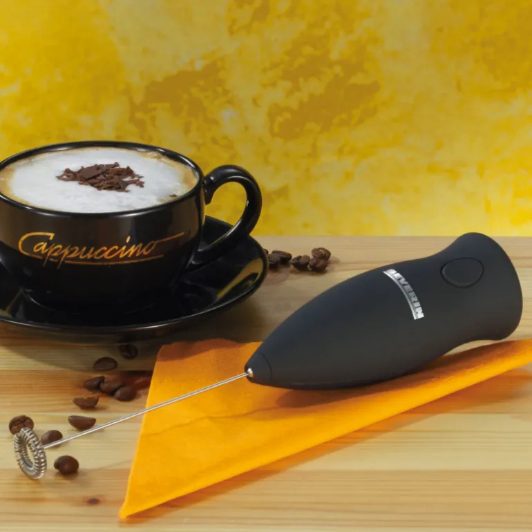 Severin SM 3590 melkeskummer. Denne batteridrevne melkeskummeren bruker to AA-batterier (inkludert). Apparatet har en maksimal hastighet på ca. 11.500 o/min. Den lager melkeskum på få sekunder.