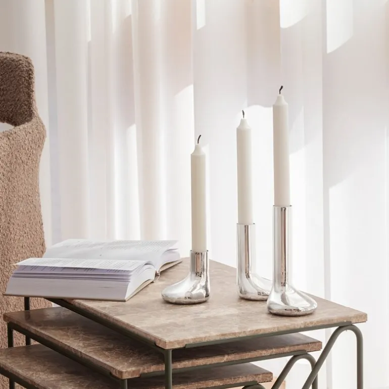 Mellow lysestake 17 cm sølv fra Eva Solo. Forgyll hjemmet med sjarmerende Mellow lysestake. Lysestaken tilfører et sjarmerende og personlig element til interiør eller dekkede bord med sin skulpturelle og lekne form. Når lyset fra flammene reflekteres i den blanke overflaten oppstår et fortryllende og dansende lysspill.