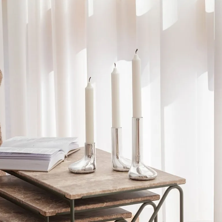 Mellow lysestake 8 cm sølv fra Eva Solo. Forgyll hjemmet med sjarmerende Mellow lysestake. Lysestaken tilfører et sjarmerende og personlig element til interiør eller dekkede bord med sin skulpturelle og lekne form. Når lyset fra flammene reflekteres i den blanke overflaten oppstår et fortryllende og dansende lysspill.