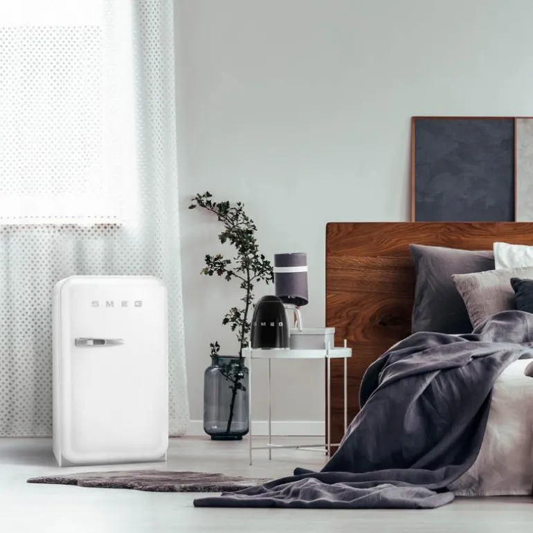 Hvitt, lite Smeg kjøleskap/minibar (FAB5) i 50-talls retro design, 73 cm, venstrehengt. Et lekkert kjøleskap i støpt plast som lyser opp ditt kjøkken.