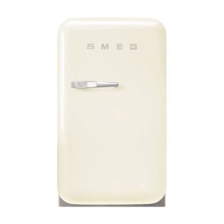 Lite kjøleskap/minibar i krem farge, FAB5 med høyrehengt dør, fra Smeg. Inspirert av 50-tallets design, utstråler dette ikoniske, fristtstående kjøleskapet tidløs eleganse og vil være et iøynefallende tillegg til ethvert kjøkken.