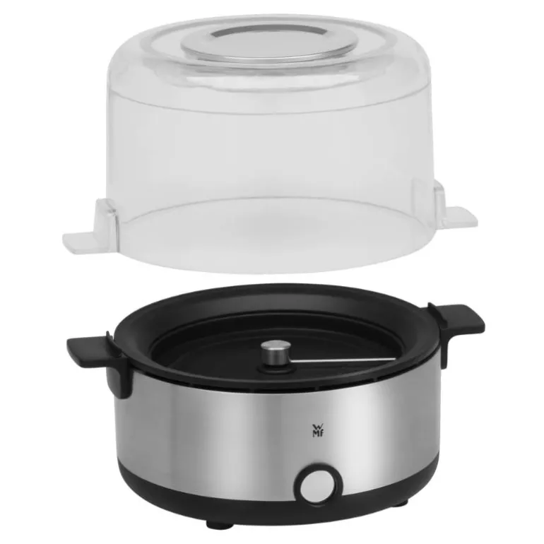 Endelig! Hjemmekinokvelder for to med hjemmelaget sprøtt popkorn. Lett, raskt og sikkert – den kompakte og kraftfulle WMF KITCHENminis popkornmaskinen med opptil 2,2 l fyllekapasitet for ubegrenset popkornfryd på få minutter. Lynrask betjening – dreiemekanismen og slippbelegget sikrer et jevnt, fettfattig og velsmakende resultat. Tilsett ganske enkelt de ønskede aromaene via matehullet i lokket, som også fungerer som en elegant serveringsskål. Herlig ren: ingen klissete fingre takket være WMF Easy Handling. Snu ganske enkelt maskinen opp-ned, og hell det ferdige popkornet opp i serveringsskålen. Og som om ikke det var nok, forhindrer Cromargan®-innsatsen i det avtakbare lokket at smør- og oljerester havner på bordet. Praktisk bonus: Overflaten i matt Cromargan® og håndtaket forblir kaldt og kan berøres under drift.