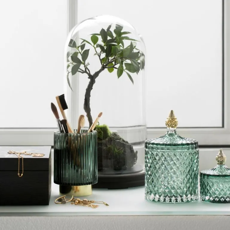 En krukke fra Miya-serien fra Lene Bjerre er ikke bare en glasskrukke – det er et ekte kunstverk! Denne krukken skaper umiddelbart oppmerksomhet i hjemmet med sitt elegante design og unike glassmønstre. Den er ikke bare et dekorativt element, men også utrolig praktisk. Bruk krukken til å oppbevare alle dine smykker eller andre småting på en smart og stilig måte.